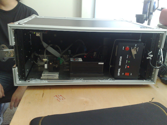 Well, we had a bunch of parts hanging around (a 1W 532 DPSS, some DT40s, an FB3 and a power supply) so this weekend we decided to turn them into a projector.