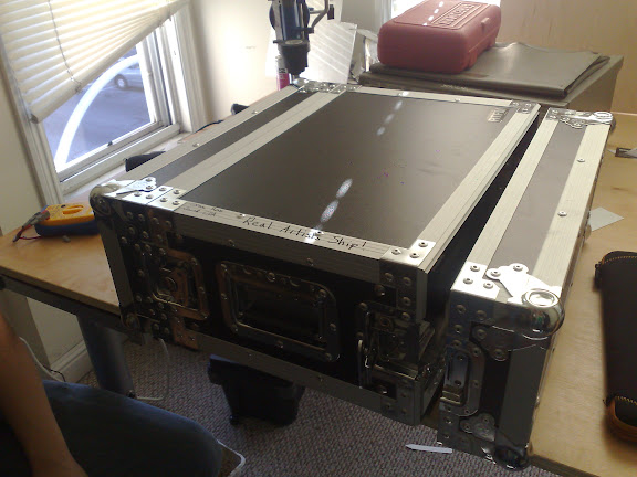 We needed a case. When I measured the chunk of aluminium we had hanging around it turned out to have almost exactly the same footprint as a Technics SL1200 so it was obvious that the music store was the place to go. We bought an Odyssey 4U rack case- highly recommended; these flight cases have two removable ends and are almost exactly perfect for a projector project.